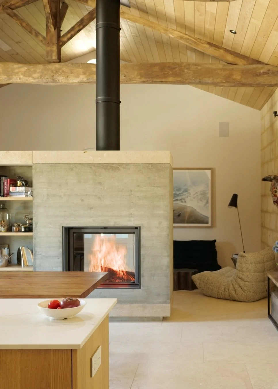 The warmth of rustic style meets the sophistication of modern design in one of 2025’s most popular trends. Think: reclaimed wood beams, raw stone textures, and matte black finishes surrounding streamlined fireplace inserts. It’s the perfect blend of cozy and contemporary—a look that fits just as easily in a rural country setting as it does in an urban suburban home. This hybrid aesthetic is perfect for those who want character and clean lines.